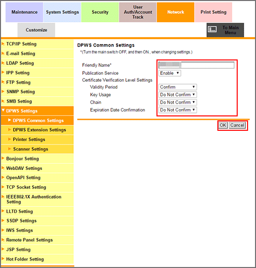 Click DPWS Settings - DPWS Common Settings on the menu of Network tab to display this screen. This screen allows you to configure settings to detect the machine via the Web service.