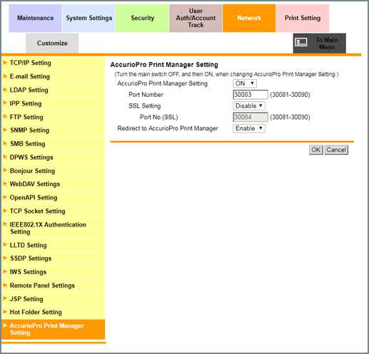Click AccurioPro Print Manager Setting on the menu of Network tab to display this screen.