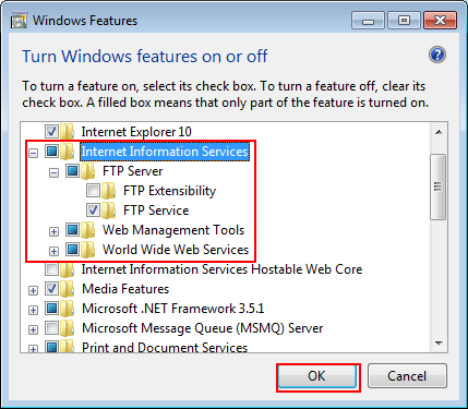Click Internet Information Services and FTP Service, and click OK.