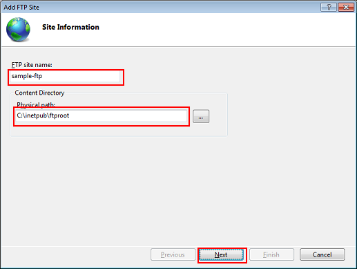 Enter an FTP site name and content directory, and then click Next.