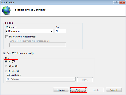 Select No SSL for SSL, and then click Next.