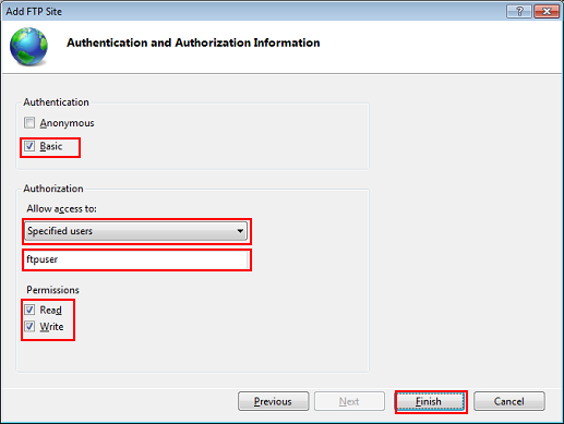 Set the authentication and authorization information, and then click Finish.