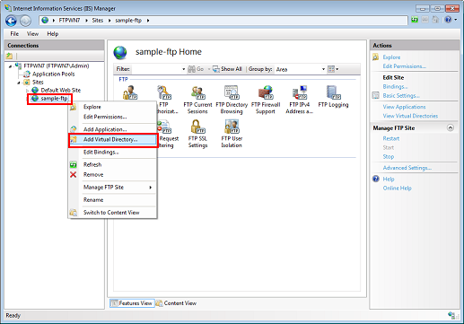 Open Sites in the connections list of the left area on the screen and right-click the FTP site created, and then click Add Virtual Directory.