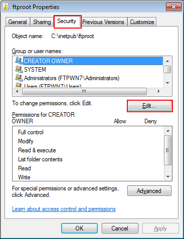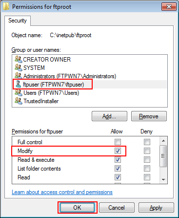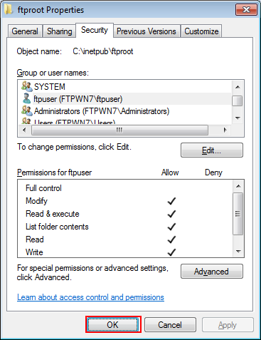 Example: Access permission is given to FTPWN7\ftpuser.