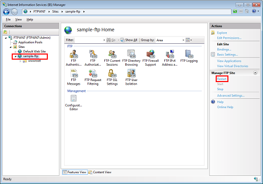 Select the FTP site, and then click Restart.