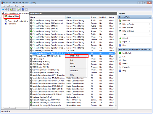 Select Inbound Rules and right-click FTP Server Passive (FTP Passive Traffic-In), and then click Enable Rule.