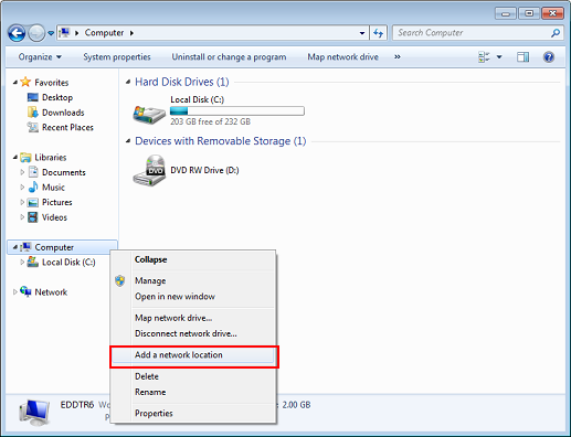 Right-click Computer and click Add a network location.
