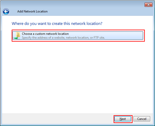 Select Choose a custom network location and click Next.