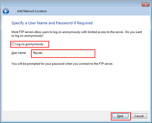 Remove the check from Log on anonymously and enter the user name, and then click Next.