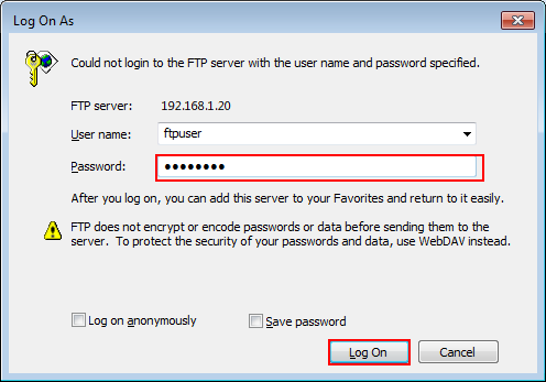 supplementary explanationIf the user name is unknown or the account is not created, refer to Creating a user account for FTP site.