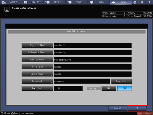 supplementary explanationTo use a proxy server when sending to the FTP server, set Proxy to ON. In this case, configure a proxy server setting in UTILITY in advance. For details about Network Setting, refer to NIC Settings.