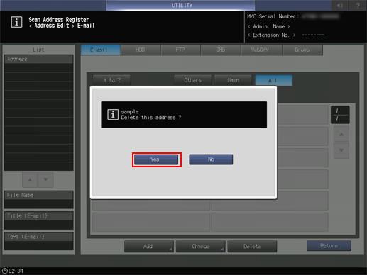 Press E-mail, HDD, FTP, SMB, WebDAV, or Group to display a destination to delete.