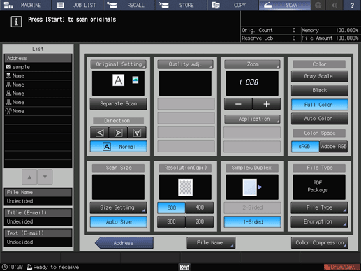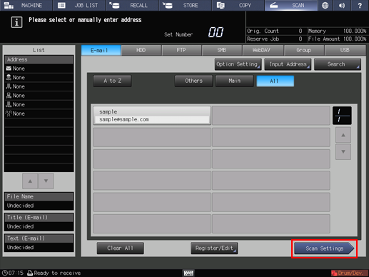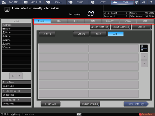 Press SCAN tab to display the SCAN screen, and select the desired scan function.