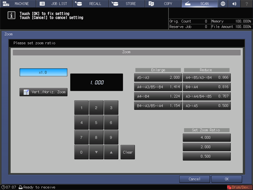 Select the desired zoom ratio from the values registered in Utility/Counter - User Setting - System Setting - Set Zoom Ratio Setting.