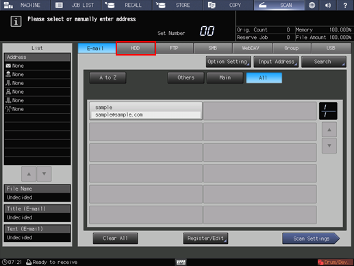 • supplementary explanationAs default, the E-mail address list is displayed. For details about the default destination tab on the SCAN screen, refer to User Setting: Scan Setting.