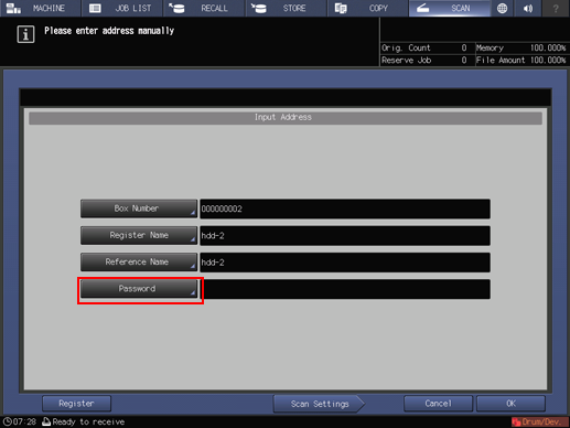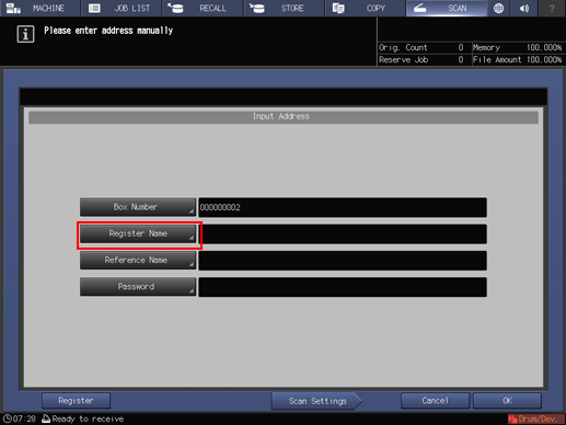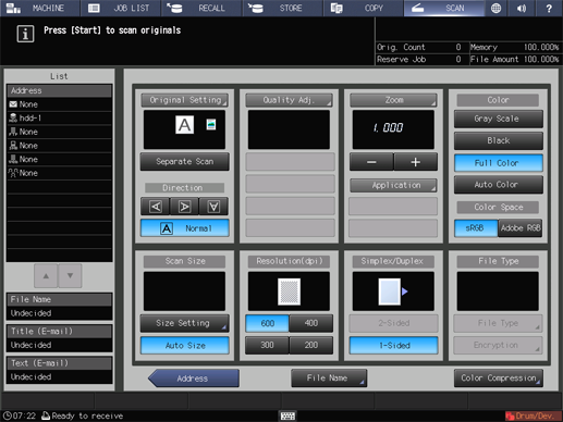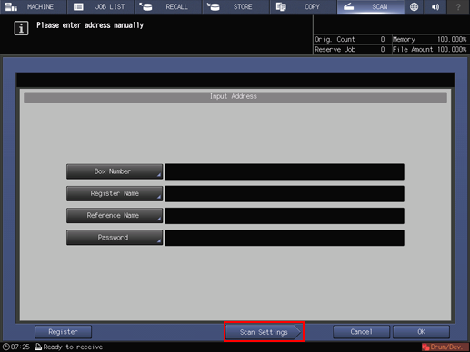• supplementary explanationThe settings on the Scan Settings screen and the address selected on the SCAN screen may remain until the machine is restarted. It is recommended to release the setting and address once the operation is completed.