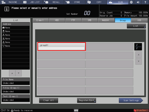 • supplementary explanationAs default, the E-mail address list is displayed. For details about the default destination tab on the SCAN screen, refer to User Setting: Scan Setting.