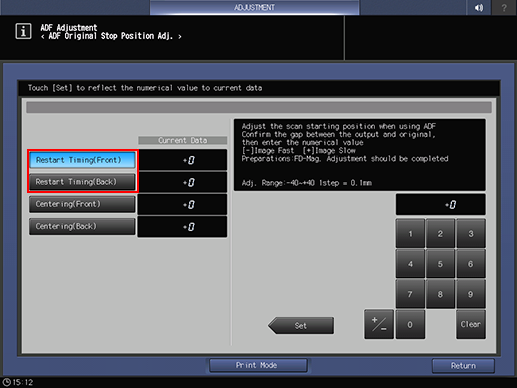 Objects of Adjustment: Restart Timing(Front), Restart Timing(Back), Centering(Front), Centering(Back)