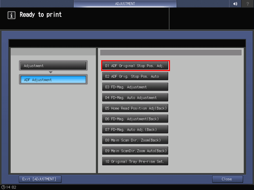 Press ADF Adjustment and ADF Original Stop Pos. Adj. in sequence.