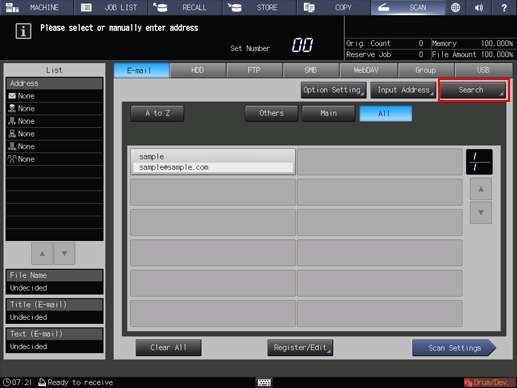 Use this function to search a desired address among registered addresses. Searchable addresses include E-mail addresses, storage locations on the HDD, FTP server addresses, SMB server addresses, and WebDAV server addresses.