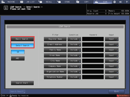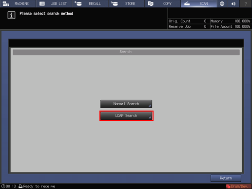 You can acquire the information meeting the search conditions entered on the control panel from the data base in the LDAP server. You can also select the acquired E-mail address, and then send or register the scan data.