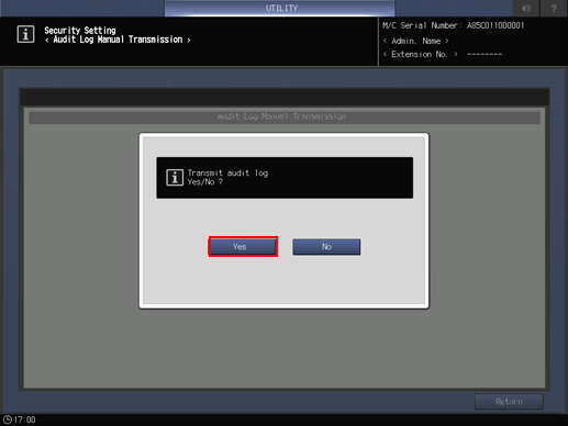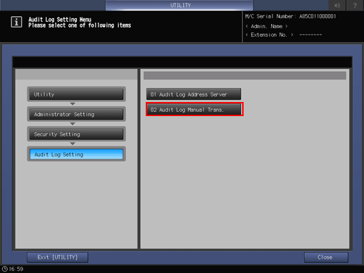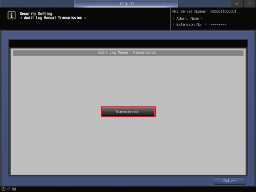 2. On the Administrator Setting Menu screen, press Security Setting - Audit Log Setting - Audit Log Manual Trans..