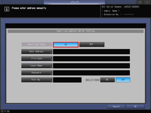 2. On the Administrator Setting Menu screen, press Security Setting - Audit Log Setting - Audit Log Address Server.