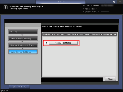 2. Press User Auth./Account Track, Auth. Device Settings, and General Settings on the Administrator Setting Menu screen in sequence.