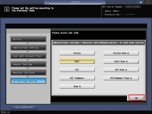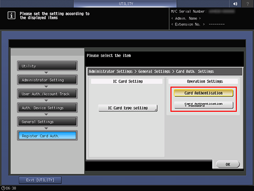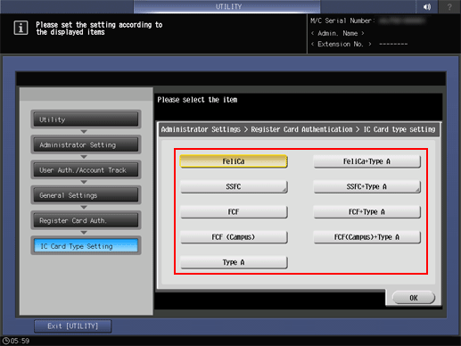 3. Press IC Card Authentication and IC Card Type Setting, then select the IC card to use.