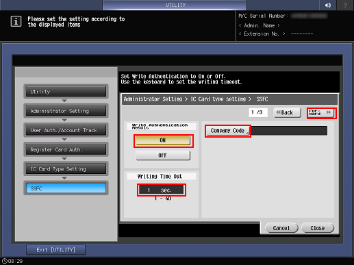 • supplementary explanationPress ON in Write Authentication Result, and type the second value for Writing Time Out using the keypad. Specify the time-out between 1 and 40 seconds.