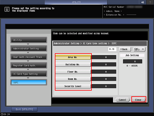6. Press Area No., Building No., Floor No., Room No., and Security Level to enter the setting values, and press Close.