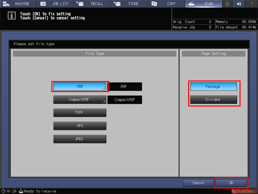 4. Select PDF in File Type and Package or Divided in Page Setting. Then press OK.