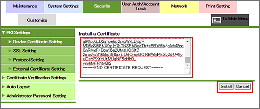 Paste the CSR (Certificate Signing Request) in PEM text format delivered from an external CA into the text box on the screen.