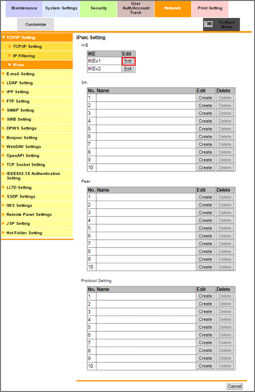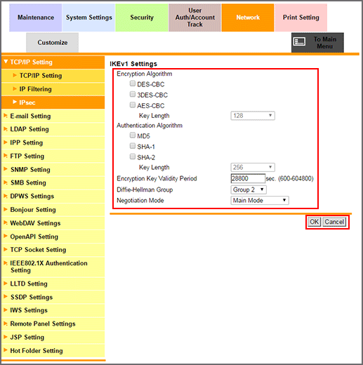 1. In the Network tab, click TCP/IP Setting - IPsec to display the IPsec operation selection screen.