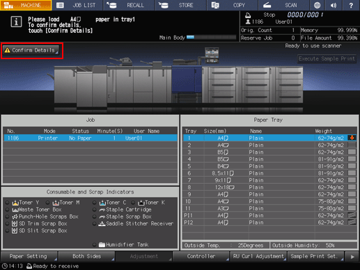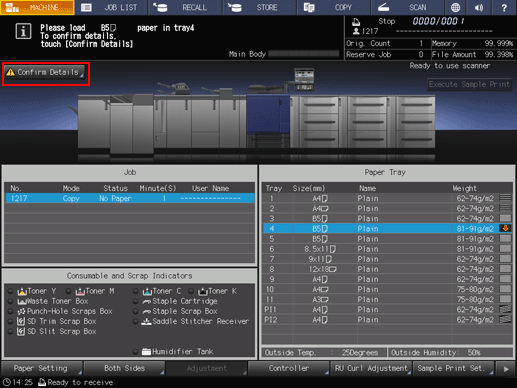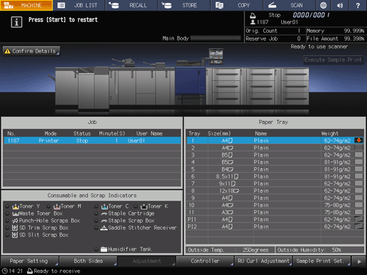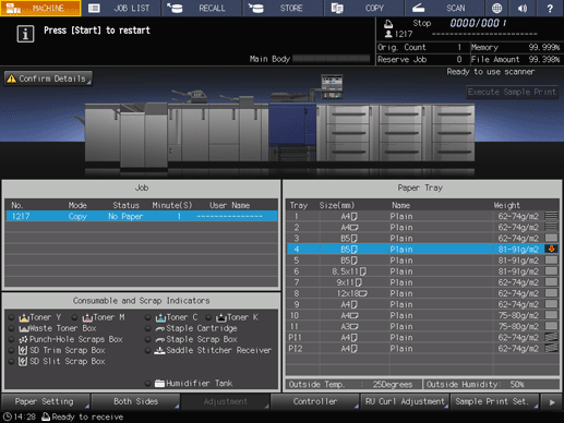 supplementary explanationWhen the tray is replenished with paper, the message changes to Press [Start] to restart.
