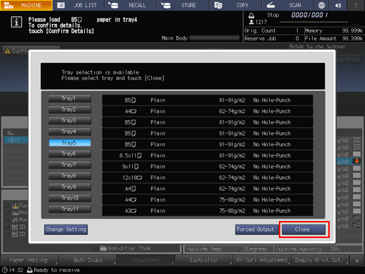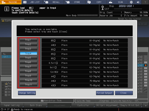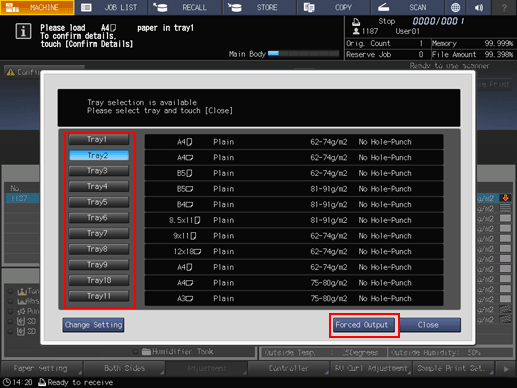 Press a tray key to be used and then press Forced Output.