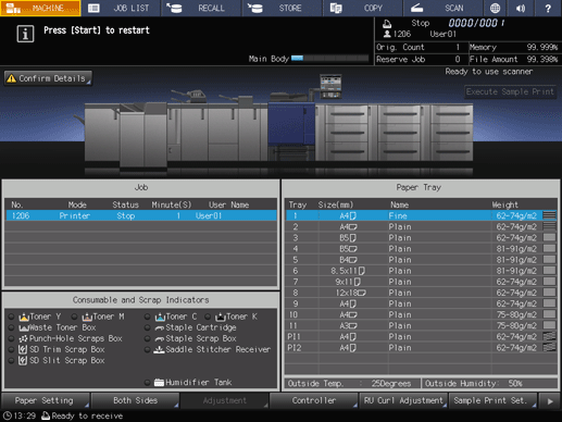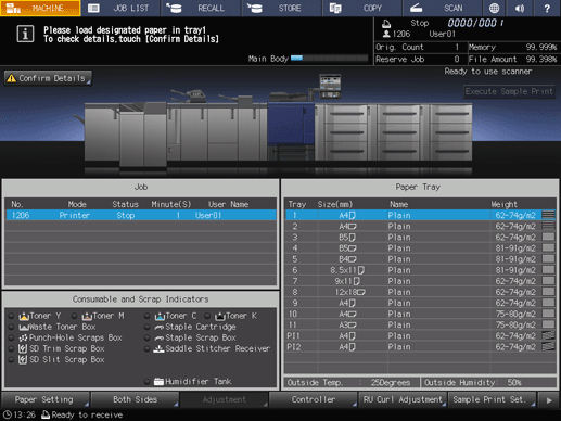 When a tray is specified for the received print data, if the paper of the specified tray does not match the paper conditions, the machine stops temporarily.