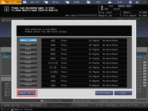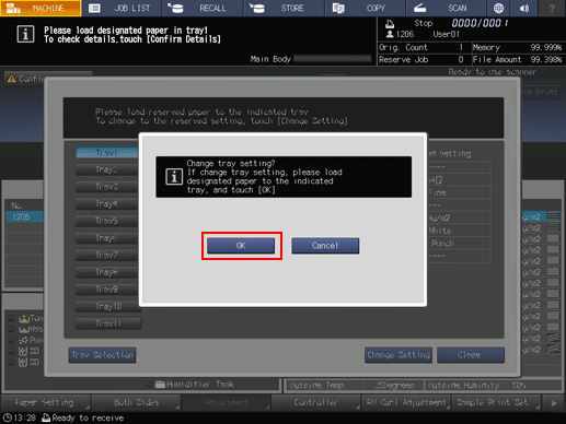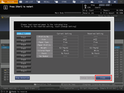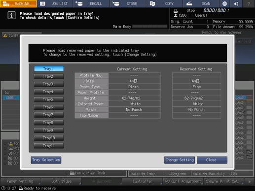When the message that designates a specific tray is displayed, change the paper settings of the tray (Current Setting) to settings that the print data requires (Reserved Setting). Load the tray with paper that conforms to specified conditions, and then start printing.