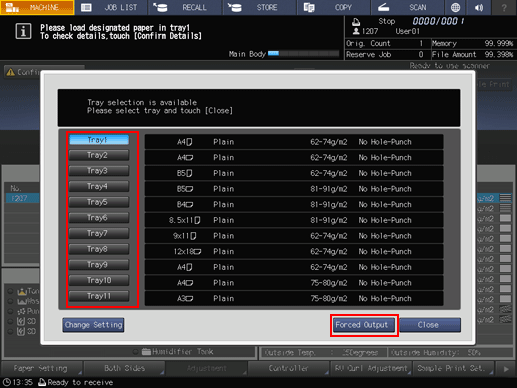 Press a tray key to be used and then press Forced Output.