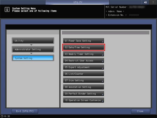 2. Press System Setting on the Administrator Setting Menu screen, and then press Date/Time Setting.