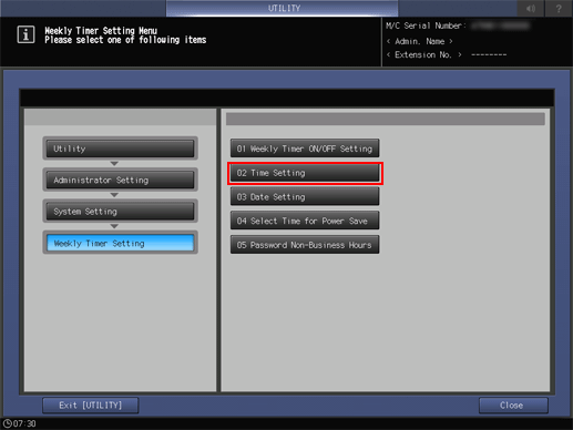 Press System Setting on the Administrator Setting Menu screen, and then press Weekly Timer Setting and Time Setting in sequence.