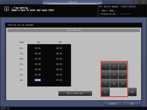 supplementary explanationUse the touch panel keypad or the keypad on the control panel to enter the desired ON/OFF time. Press Set to shift the highlighted area.