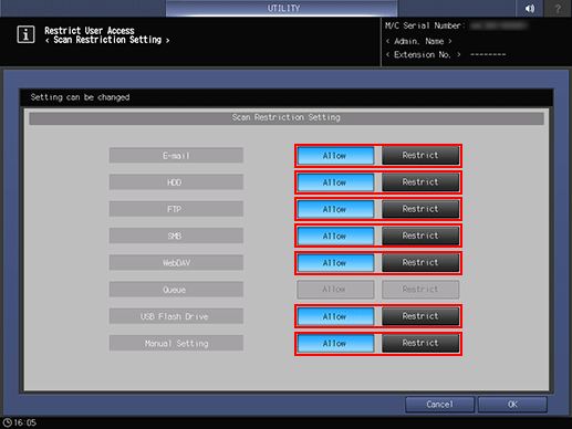 Press System Setting, Restrict User Access, and Scan Restriction Setting in sequence.