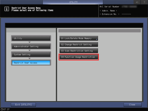 Press System Setting on the Administrator Setting Menu screen, and then press Restrict User Access and Function Usage Restriction in sequence.