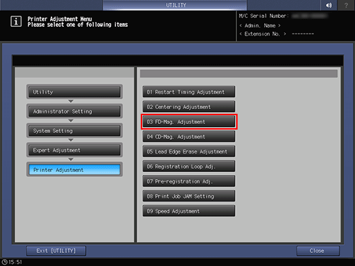 Press System Setting on the Administrator Setting Menu screen, and then press Expert Adjustment, Printer Adjustment, and FD-Mag. Adjustment in sequence.