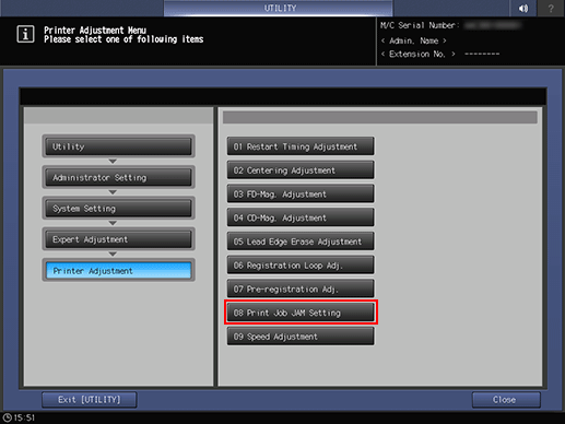 Press System Setting on the Administrator Setting Menu screen, and then press Expert Adjustment, Printer Adjustment, and Print Job JAM Setting in sequence.
