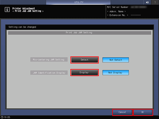 In order to enable the Mis-centering JAM Setting, Mis-centering Detect JAM, provided in Expert Adjustment in Paper Setting, must also be set to Detect.