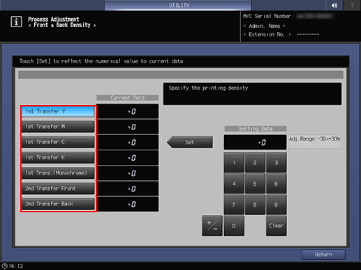 Press System Setting on the Administrator Setting Menu screen, and then press Expert Adjustment, Process Adjustment, and Front & Back Density in sequence.