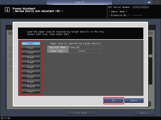 Be sure to use the paper for registering a desired density to perform Max. Density Auto Adj. (RU). With an unregistered paper, the adjustment cannot be performed correctly.