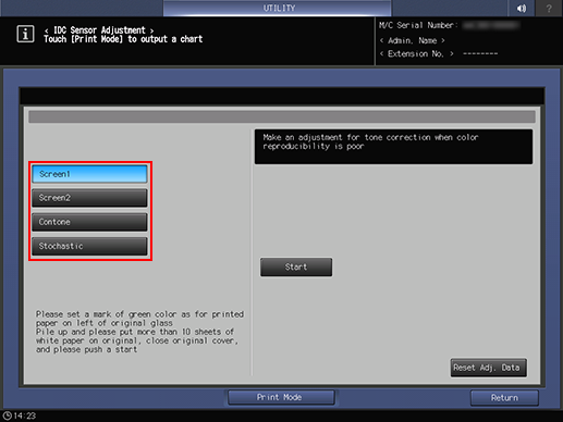 Press System Setting on the Administrator Setting Menu screen, and then press Expert Adjustment, Quality Adjustment, and IDC Sensor Adjustment in sequence.
